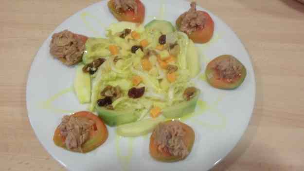 - Posem l’escarola al mig del plat,despues posem l’alvocat,la poma i al damunt els navius, les nous i el formatge.al voltant i posem el tomàquet i al damunt la tonyina
