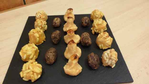 - Ara la part de massa que ens quedaba fem unes boles i les passem per l’ou i pinyons i posem a la plata