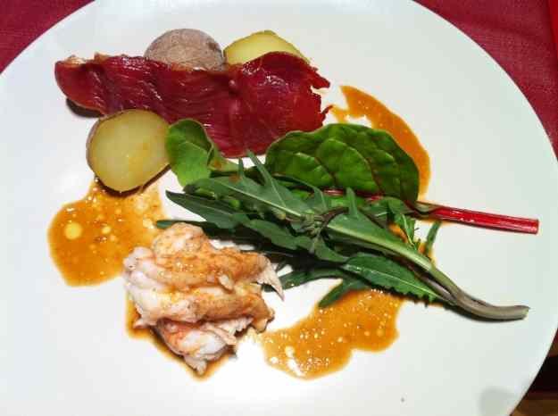 Per a la vinagreta barregeu una miqueta de l´oli de fregir el pernil, oli extra verge, uns 200 ml de la salsa d´escamarlans (que us ha de quedar més aviat líquida, no a textura de salsa), una mica de vinagre de vi i si voleu un xic de pebre vermell picant o pebre de cayena. Molt poc.