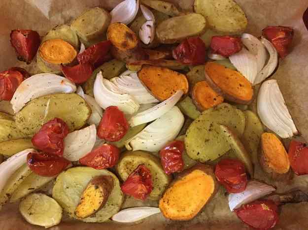 - Preescalfar el forn a 220 graus. Sobre una safata de forn amb paper, col.locar les verdures untades d’oli i pebre. I al forn durant 30 mins.
