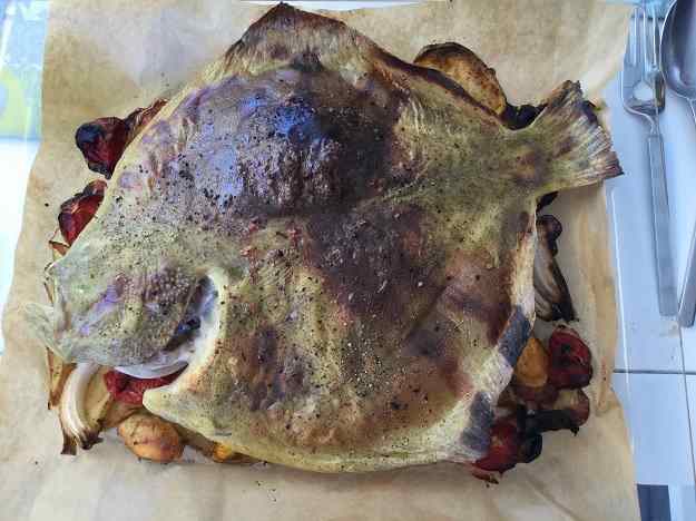 - Passat aquest temps, treure la safata del forn i col.locar a sobre el turbot amb pebre i oli per les dues cares. Regar amb vi o vermut. Coure durant 30-35 minuts i ja estarà llest!