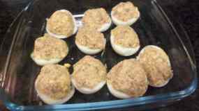 - Mentres posem aigua amb una olla , la posem al foc i posem els ous, i quan bulli deixem bullir uns 10 minuts, un cop cuits els pasem per aigua freda i els pelem, i separem les clares dels rovells.