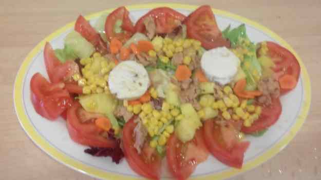 - Posem l’enciam a la plata,el tomáquet al voltan de l’enciam ,per el damunt i posem la tonyina, la pastanaga i el blat de moro