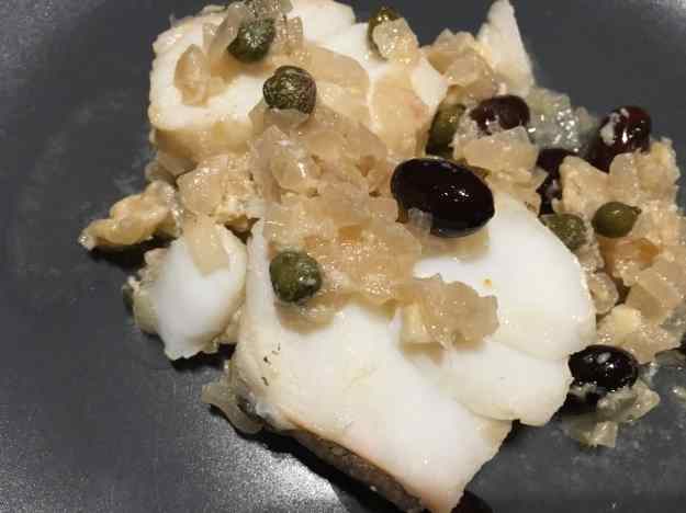 Tallem i piquem la ceba, comencem a sofregir-la i n´afegim les anxoves picades. En uns minuts hi posem els talls de bacallà, i després el vi, les olives i les tàperes. Ho deixem coure uns minuts, remenant la cassola de tan en quan, i llestos. Tan bon punt veiem que el bacallà és cuit ho retirem i servim.