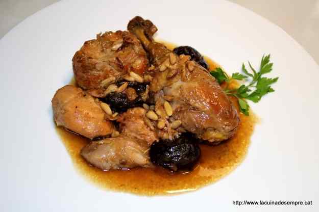 - Quan faltin uns 20 minuts per acabar definitivament la cocció del pollastre, hi tirarem els pinyons. Hi ha qui torra lleugerament els pinyons en una paella abans d’incorporar-los també.