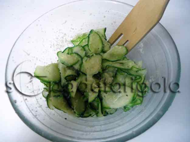 - Rentem bé el carabassó, el tallem amb una mandolina o similar a rodanxes ben fines, sense pelar.