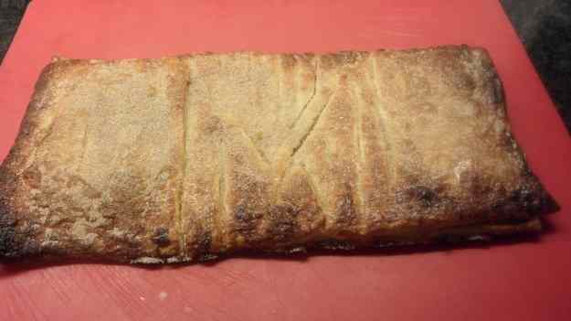 - Estenem la pasta de full sobre la plata i la tallem per la meitat,a sobre de una part hi posem la melmelada,a l’altre part i fem uns talls per decoració