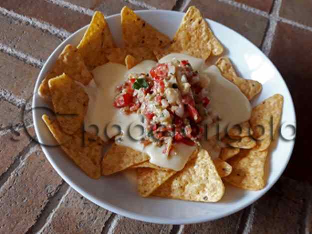 Tallem el formatge a trocets el barregem amb la crema de llet, el fem desfer al microones a mitja potència i anem remenat a intervals de 2 minuts fins que quedi ven barrejat. Posem en un bol, plat… els nachos i tirem el formatge calent per sobre i hi espolsem pebre negre. Ho servim calent.