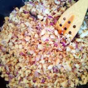 3. Després s’hi afegeix el julivert picat, la cúrcuma i una mica de pebre negre, es remena i es deixa un parell de minuts més