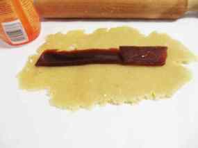 - Estirem la base de massapà i hi afegim al centre el codonyat.