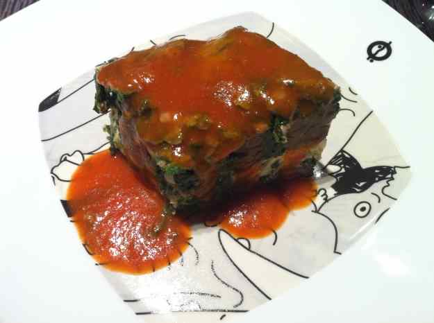 Posem a escalfar el forn a 180 i disposem una plata amb aigua per coure-ho al bany maria. Posem en un motlle primer la barreja d´espinacs, al mig la de formatges i a sobre de tot la de julivert, i mentre es cou preparem una salsa de tomàquet casolana: escaldem, pelem i treiem les llavors dels tomàquets mentre es va fent un sofregit de ceba i pastanaga amb una mica de cansalada picada fina. Afegim el tomàquet juntament amb el concentrat, remenem bé, afegim les herbes i aigua fins a cobrir i deixem coure a foc mitja una mitja hora. passem pel xino i reduim si es necessari i tindrem el complement perfecte per a un pudding boníssim!