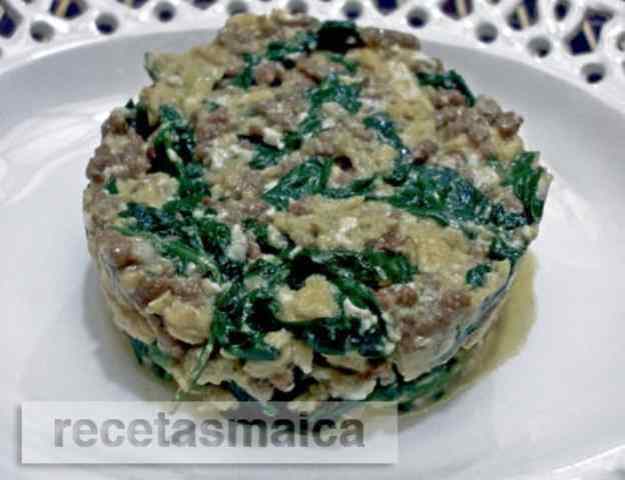 - Quan la carn estigui cuita, afegiu-hi els espinacs en cru; un cop fets, tireu-hi els quatre ous batuts, fins que es quallin.