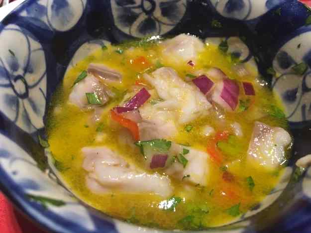 Talleu el peix en daus, el salpebreu i el barregem amb l´all ben picat i l´ají limo (una mena de pebrot picant…el podeu trobar congelat en botigues de productes llationamericans o, amb sort, fresc en alguna parada de la Boqueria). Ho guardem en un tupper amb el suc de llimona, l´ají groc liquat (ají groc, que per cert és taronja, triturat amb oli…millor sense llavors) i la ceba. Deixeu que marini uns deu minuts a la nevera, hi afegiu el cilantre i serviu.