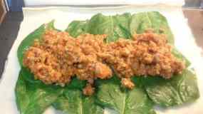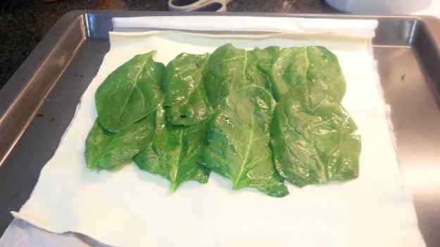 - Posem paper de forn a la plata i posem la pasta de full, al damunt i posem unes fulles d’espinacs