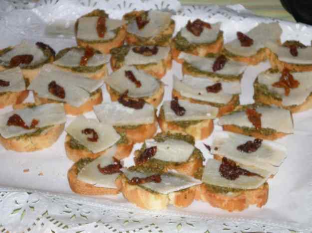 - Repartiu el pesto sobre les torrades, cobriu amb el parmesà i les tires de tomàquet. Afegiu un rajolí d’oli i serviu.