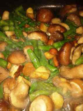 - Trosseja els espàrrecs i ajunta’ls amb els bolets, posa al foc una paella o cassola amb una mica d’oli ben calent, tira-hi la barreja, salpebra-ho i reserva-ho.