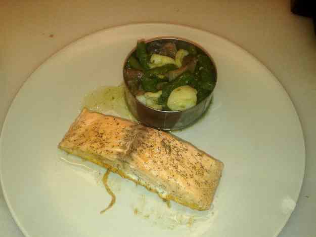 - Acompanya el salmó amb el saltejat de sípia i verdures. Pots donar forma al saltat amb una anella.