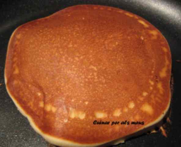 - Posem al foc una paella petitona on no s’enganxi res. Passem una mica de mantega i recollim l’excés amb paper de cuina. La mida del pancake és un cullerot. Quan la paella estigui calenta hi aboquem la massa. S’ha de girar quan comença a desenganxar-se de les parets de la paella. I així anem fent fins que ens quedem sense massa.