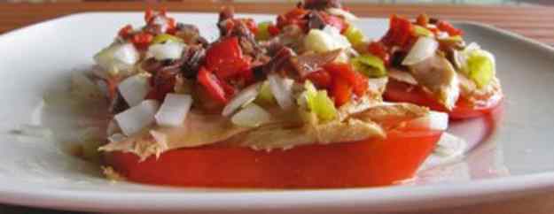 Tallem a daus petits, ceba tendra, bitxo en vinagre “guindilla”, pebrots del piquillo, anxoves. La tomata de bitxo la tallarem a lamines una mica gruixudes -1cm- i les posarem les primeres al plat fem un primer llit amb un raig d’oli i sal maldon, a continuació posem els filets de ventresca per sobre un a un fer un segon llit i a continuació els daus primer la ceba tendra amb el bitxo en conserva i després els pebrots de piquillo i les anxoves i tornem a posar ara sal maldon i un bon raig d’oli d’oliva verge del bo.