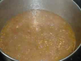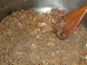 - Passats els 10 minuts afegim a la cassola les llenties. Hi tirem el 1/2 litre d’aigua mineral tèbia i el 1/2 de brou que també el tindrem tebi,