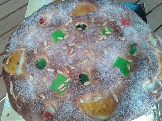 - Estireu-la sobre una placa de forn untada amb oli o mantega. Ha de tenir un gruix de 1 cm. aprox. i forma ovalada. Pinteu-la amb ou batut i poseu la fruita confitada a trossos, i deixeu-ho reposar fins que dobli el volum.
