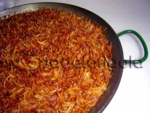 - Seguidament s’hi tiren els fideus i es van remenant perquè enrosseixin uniformement i evitar que es cremin. Una vegada ben rossos hi tirem el fumet i es deixa coure fins que quasi no quedi fumet. Es treu del foc i es deix reposar, curiosament passats uns minuts els fideus queden tots drets.