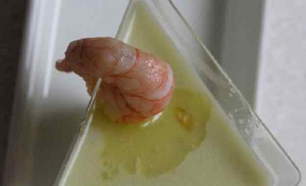- Mentrestant tallem els gran d’alls en trossos petits i ho posem en una paella amb oli verge d’oliva fins que els alls siguin daurats. Posem les gambes a la paella amb l’oli, només volta i volta. Pelem les gambes i col·loquem una gamba per got.