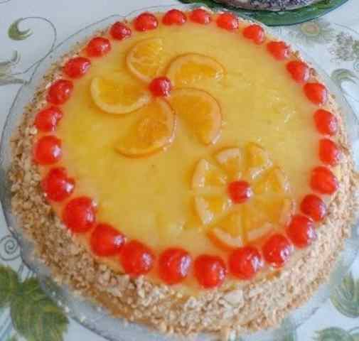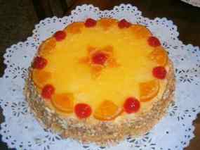 - Posem la crema pastissera dins el pastís, escampant i anivellant amb una cullera, seguidament anirem adornant amb el préssec tallat, posant els talls en forma de flor de la part de fora a l’interior del pastís.