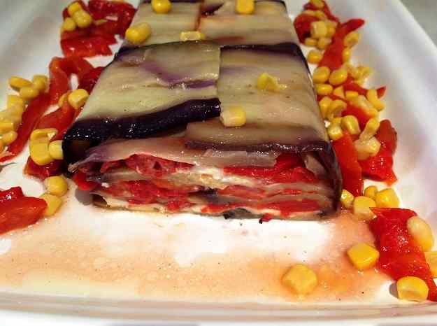 - Posarem llesques d’albergínies al fons i a les parets del motlle, i es va muntant la terrina alternant capes d’albergínia, pebrot. formatge de cabra esmicolat, (opcional: entre capa i capa posar fulles d’alfàbrega, pebre negre i una cullerada d’oli d’oliva. S’acaba amb albergínia.