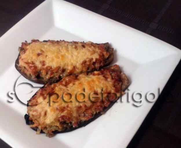 En una paella apart es fa sofregir amb oli la ceba, quan sigui ben rossa i afegirem el tomàquet ratllat i seguidament la carn picada que l’amanirem amb sal, una miqueta de nou moscada i un raig de vi blanc o brandi. Quan estigui la carn ben cuita i afegirem un parell de cullerades del formatge rallat, seguidament si remena l’ou i finalment si afegeix la carn de les albergínies. Quan està tot ben barrejat, agafarem una bandeja tipus canelons i l’untarem amb mantega, posarem la pell de les albergínies, les omplirem del farciment anterior, cobrirem amb la resta del formatge ratllat i les gratinarem.