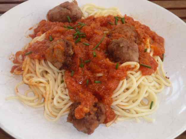 - Aboquem els espaguetis en una safata, posem per sobre la salsa de tomàquet, una mica de parmesà i per sobre col·loquem les mandonguilles. Podem guarnir una mica el plat amb una mica de cibulet.