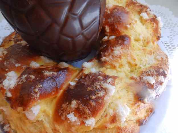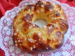 - Escalfeu el forn a 180ºC. Amb un pinzell, pinteu la rosca amb l’ou batut, humitegeu el sucre amb unes gotes d’aigua i escampeu-lo pel damunt. Enforneu de 25 a 30 minuts.