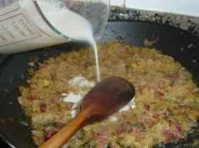 Si el bacallà no us ve preparat, el piqueu. En un bol barregeu el bacallà, all i julivert picat (jo ja tenia el julivert incorporat), la farina de galeta, un ou batut, un polsim de nou moscada, un polsim de pebre i una mica de sal si fes falta, que probablement no. Ho barregem bé i fem boletes. Les enfarinem i cap a fregim en oli d’oliva. Quan estiguin ben rosses (important: jo n’he deixat alguna de menys fregida i més tard se m’han trencat, incidint greument en l’estètica del plat -que no el gust-) les traiem i les reservem sobre paper absorvent.