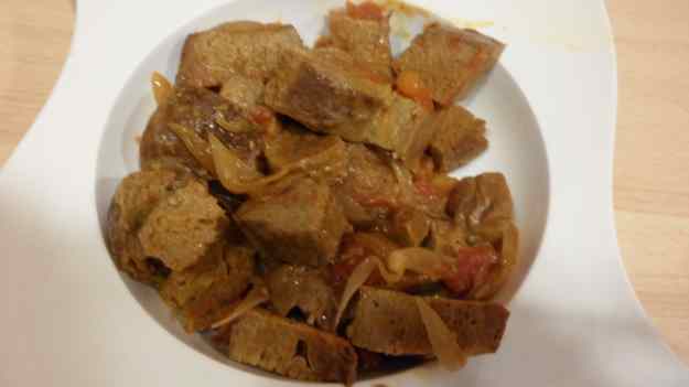 - tomáquet sigui cuit i posem una mica de conyac deixem avaporar una mica i afagim el seitan tallat que fasi uns minuts la xup.xup