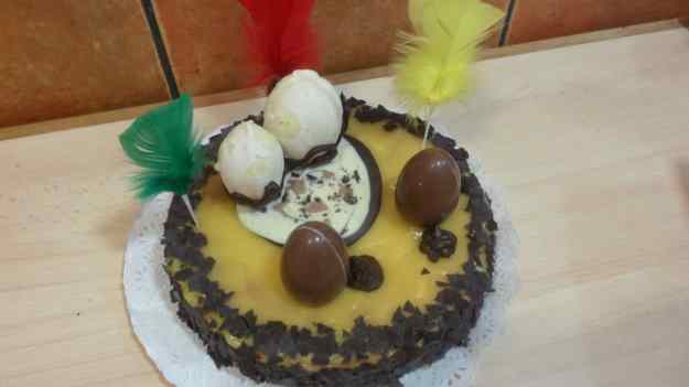 - Ara posem la gema al damunt i als costats, i als costats i enganxem granets de xocolata i guarnim amb ous de xocolata i unes plumes.
