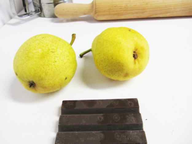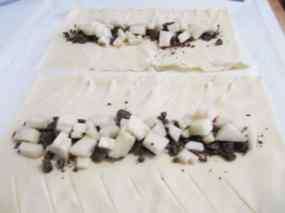 - Estirar la pasta de full amb un corró i donar forma rectangular si no la té ja. Fem talls a ambdós costats deixant lliure la part central. (Podeu mirar el pas a pas de la recepta de la trena de cabell d’àngel). Posem la pera trossejada i trossos de xocolata a la part central.
