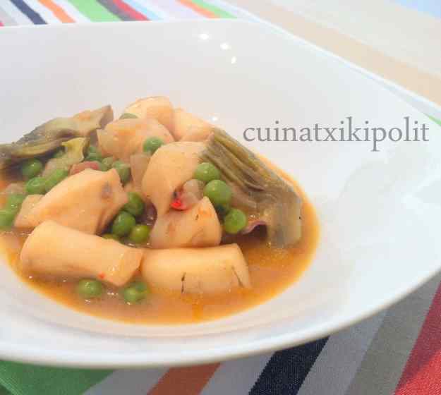 - Finalment afegiu en aquest ordre el vi, la sípia, els pèsols i les carxofes. Quan hagi evaporat l’alcohol poseu-hi un got de fumet, i aneu-lo afegint a mida que vegeu que s’evapora i que les verdures queden ben desintegrades formant una salsa.