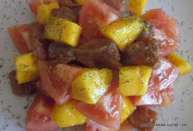 - Pelem els tomàquets, els tallem a daus i reservem.