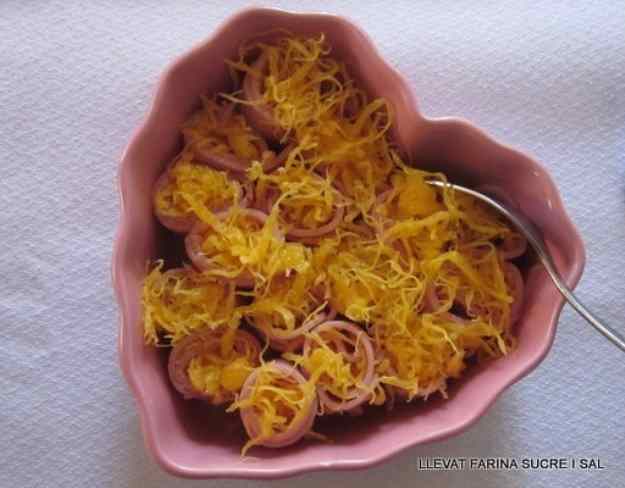 - Farcim els talls de pernil de York, d’ou filat, i els anem cargolant una mica apretadets, els tallem amb un ganivet ben esmolat d’un gruix de 2 o 3 cms. i ja els tenim a punt .