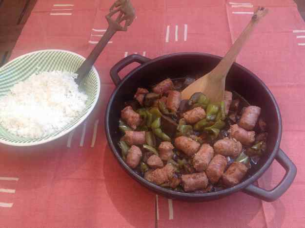 Botifarres amb pebrots verds i albergínies