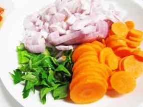 - Ara trossegem la pastanaga, la ceba, l’api i un gra petit d’all.