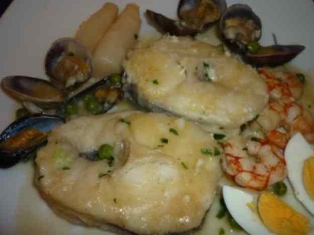 - Incorporem la picada i un got de vi blanc. Si el peix no queda cobert de brou n’afegim una mica més. Per últim hi posem les gambetes, la closca, els ous tallats a quarts i els espàrrecs.