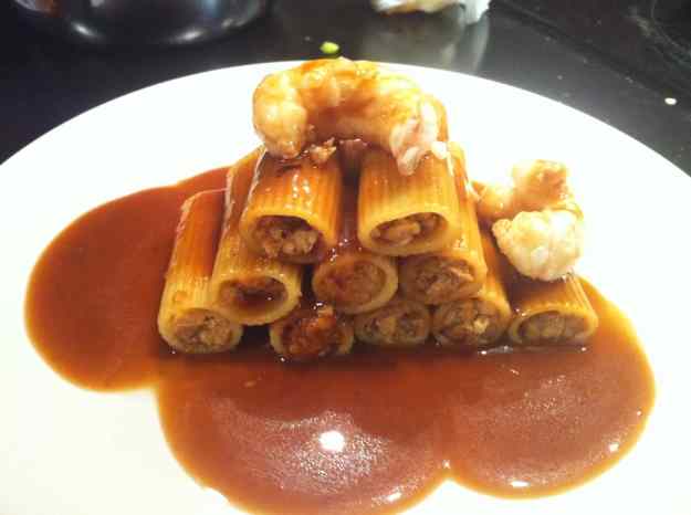 La realització de la salsa porta una bona estona, suficient per farcir els rigatonis amb el rostit de pollastre, amorosit amb una reducció de la seva pròpia salsa, i ho farem amb l´ajuda diria que imprescindible d´una màniga pastissera. Quan els tinguem tots farcits potser amb una mica de sort ja tenim feta la salsa. Una part la reservarem i l´altra serà per a regenerar (escalfar) els rigatonis farcits, amb la seva pròpia salsa. Els glassejarem. I finalment saltejarem les cues dels escamarlans.