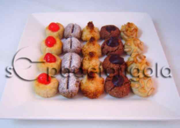 - De cireres, ametlla, avellana … Prenem trossos de massa i fem boles petites, encastem a les boles o bé cireres (les cireres tallades pel mig), avellanes o ametlles (una a cada panellet), pintem també amb clara d’ou.