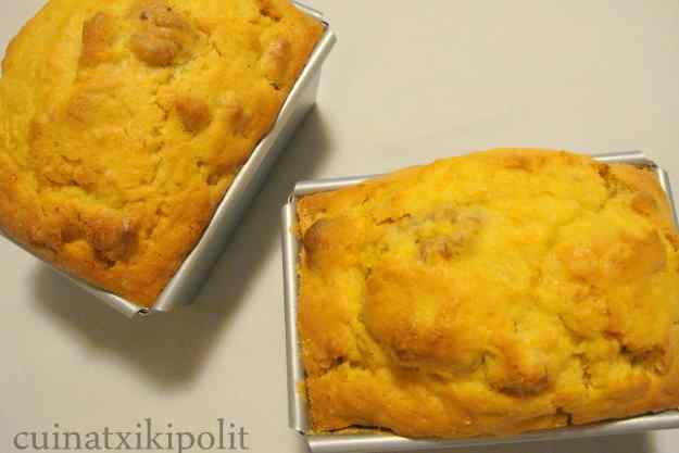 - Engrassa el motlle amb una mica de mantega i empovora’l amb farina, bolca’l perquè caigui la que sobra i ja hi pots posar la massa. Forneja uns 45 min i comprova el punt de cocció punxant amb una agulla, si surt neta ja està llest.