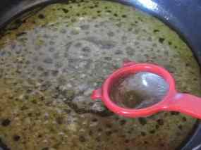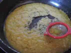 - Posem l’oli de la cassola en un bol i deixem temperar una mica. Quan estigui temperat tornarem a posar una mica d’oli a la cassola, així com una mica del sèrum del bacallà i emulsionem amb un colador movent suaument, a foc mig.