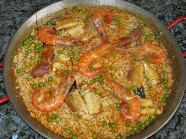 L’arròs fer-lo com sempre: a la paella amb oli fregir les gambes, treure-les i fer el sofregit amb ceba, pebrot verd, pebrot vermell i all, tot picat ben petit, tomàquet ratllat i sípia tallada a quadrets. Una bona estona, perquè el sofregit es vagi concentrant amb els gustos de les gambes, de les verdures, de la sípia… i després els pèsols i l’arròs, 100 grams per persona, ben remenat a foc fort perquè el sofregit l’impregni, i ja hi podem tirar el brou calent, coem deu minuts a foc fort i cinc a foc fluix (o 8 si es vol l’arròs més cuit).