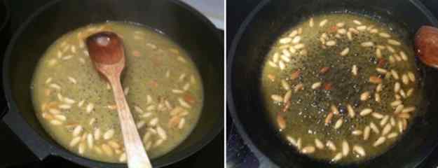 - – En una paella es posa una mica d’oli, com per a una truita a la francesa i s’hi tiren un grapat de pinyons. El foc fluixet que no es cremin els pinyons.