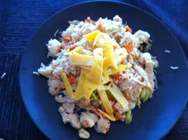 Per últim hem de tenir a punt la ceba, i la pastanada tallades…i l´all. Saltegem primer les gambes i el pollastre, i a continuació la pastanaga i la ceba, deixant l´all per al final. Afegim l´arròs, la salsa de soja, el sambal oelek, ho saltegem bé (ha de quedar ben remenat) i ho servim amb la truita tallada a tiretes (ha de quedar super fina, per això la fem en una paella ben ample).