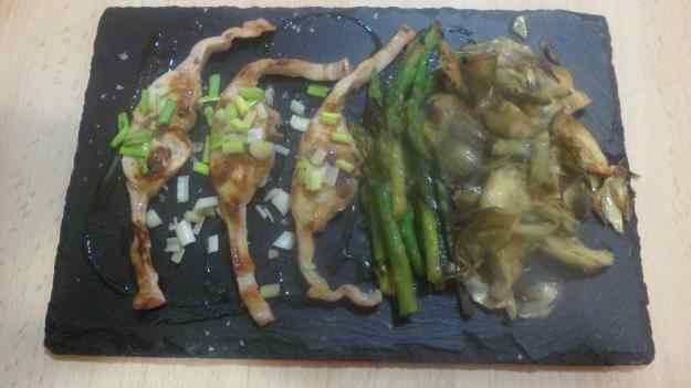 - Estenem la massa i la pintem amb el tomàquet fregit, agafem unes tires de bacon i les distribuïm sobre el tomàquet.